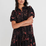 Script Black Floral Balloon Sleeve Mini Shirt Dress