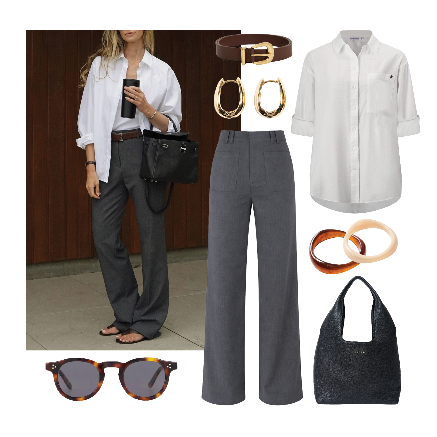 The perfect pairing of a crisp white shirt and tailored wide-leg trousers creates a look that feels instantly polished and timeless. Clean lines and neutral tones keep it refined, while gold jewellery, classic sunnies, and a sleek black tote add a modern finishing touch.