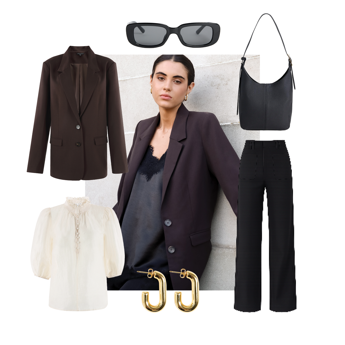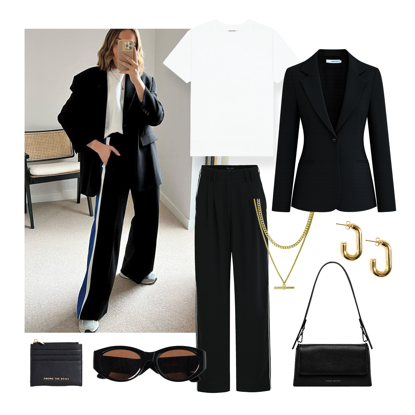 The perfect pairing of a sharp black blazer and relaxed tailored trousers brings instant confidence to your everyday wardrobe. Layered over a clean white tee and finished with gold jewellery and sleek accessories, this look balances structure with laid-back cool.