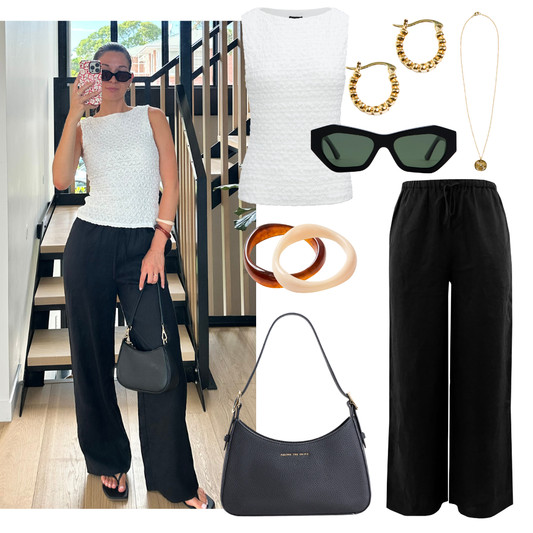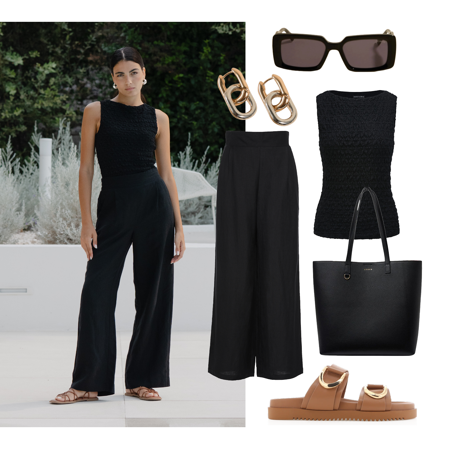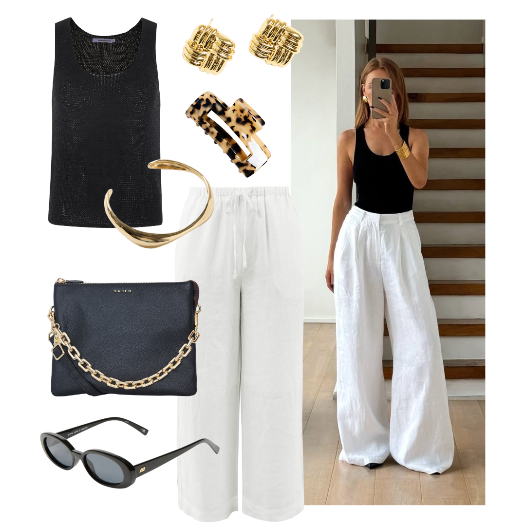 Sleek, simple, and seriously stylish. This look pairs a classic black tank with crisp white linen pants for that clean, minimal look you can wear on repeat. Just add bold gold jewellery and a structured bag to take it from AM errands to PM catch-ups with ease.
