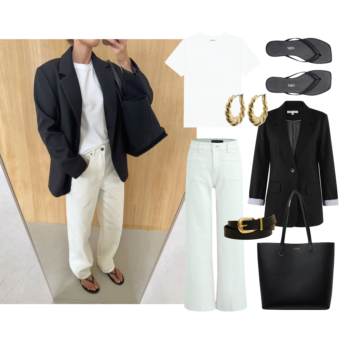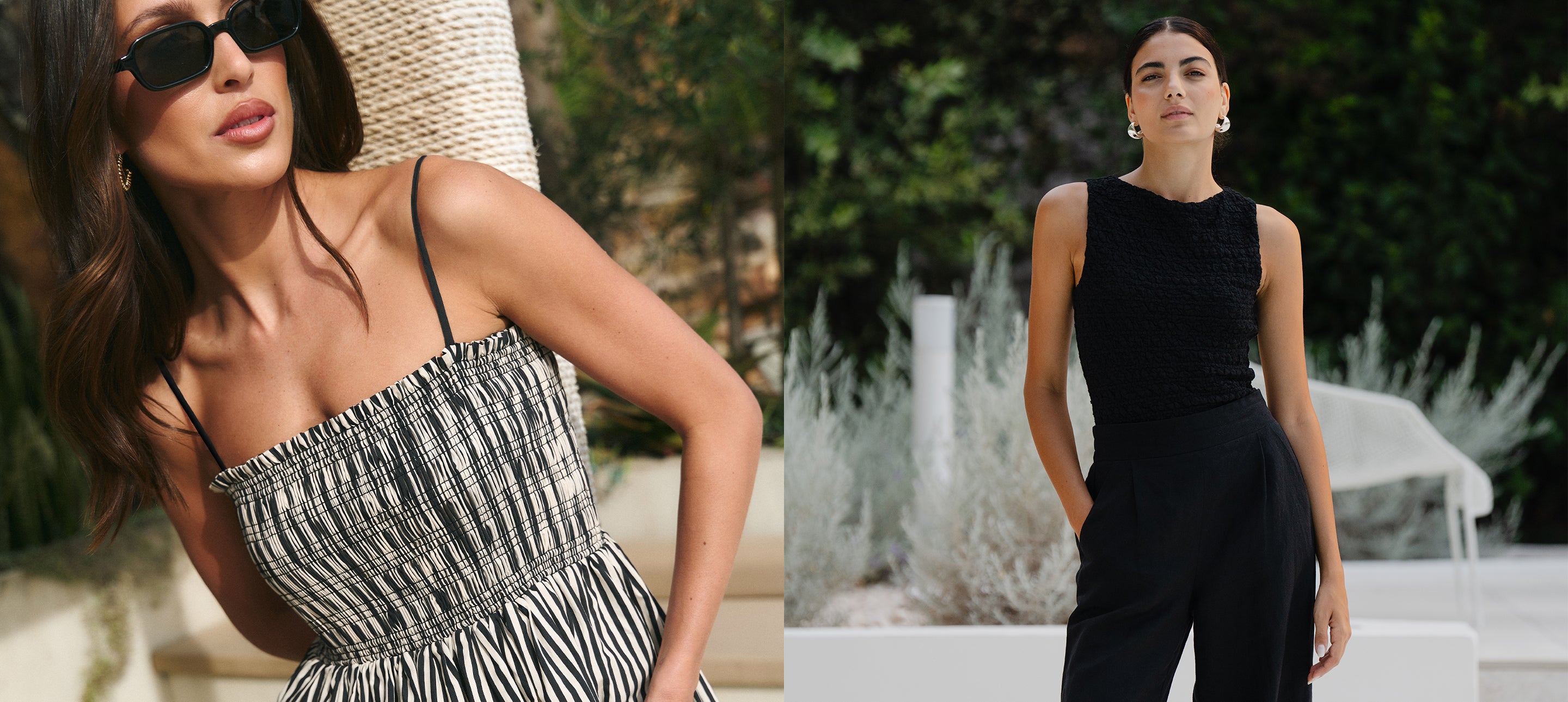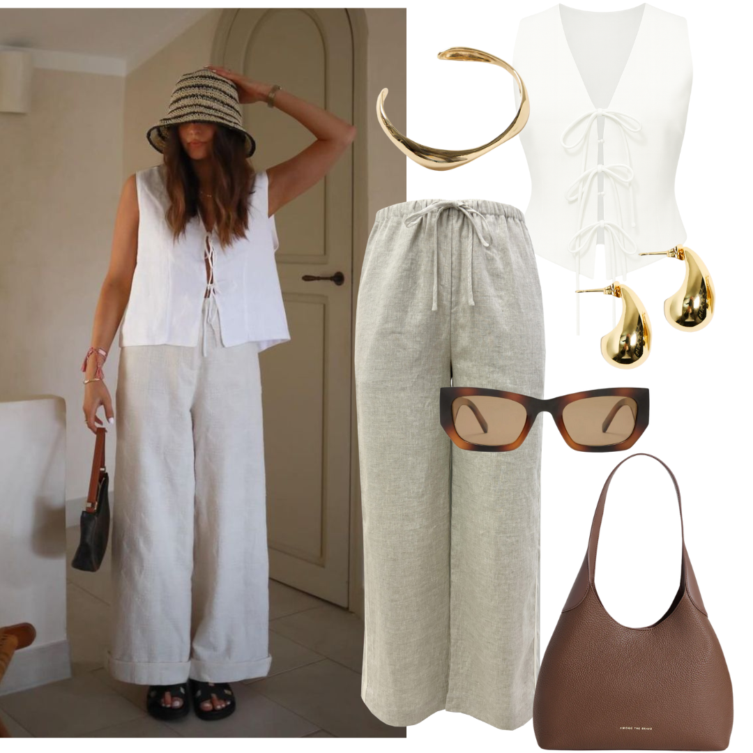 Sleek, simple, and seriously stylish. This look pairs a classic black tank with crisp white linen pants for that clean, minimal look you can wear on repeat. Just add bold gold jewellery and a structured bag to take it from AM errands to PM catch-ups with ease.