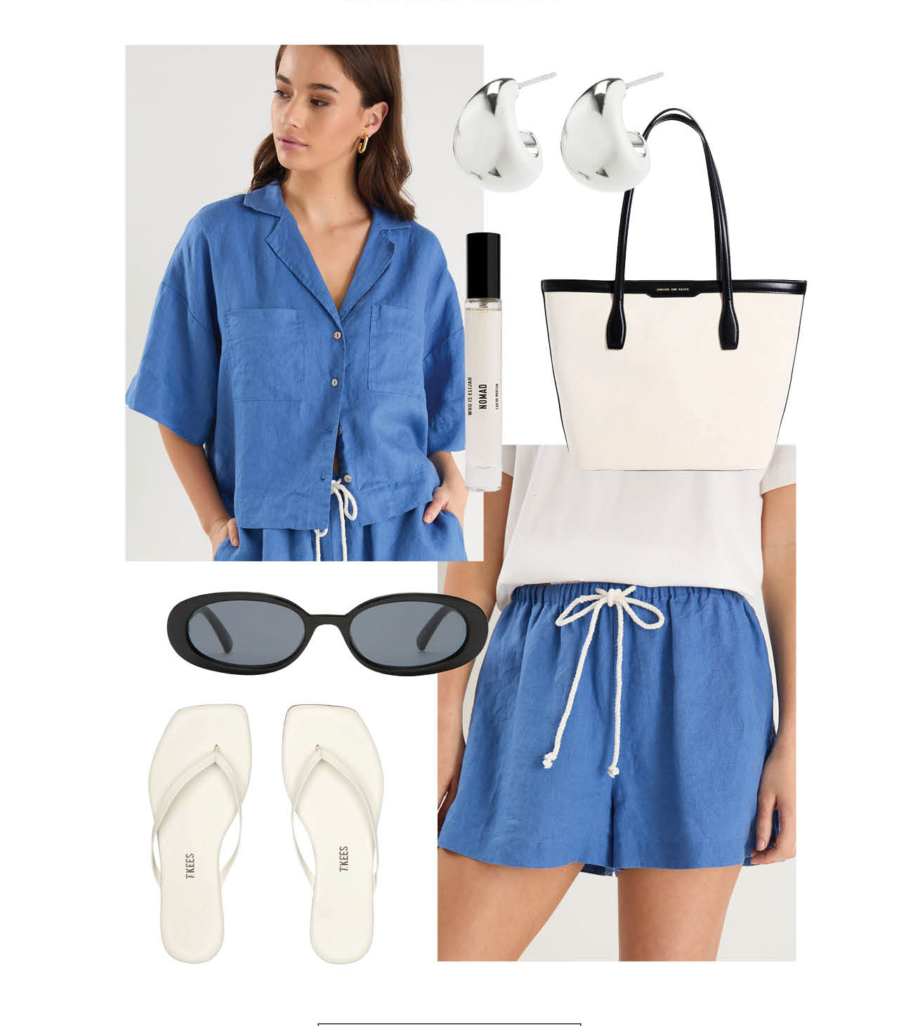 Easy, breezy, and effortlessly chic, this casual look is all about laid-back summer styling with a polished edge. The soft cornflower blue linen set brings a relaxed vibe, perfectly balanced with crisp neutral accessories for a clean, modern finish.