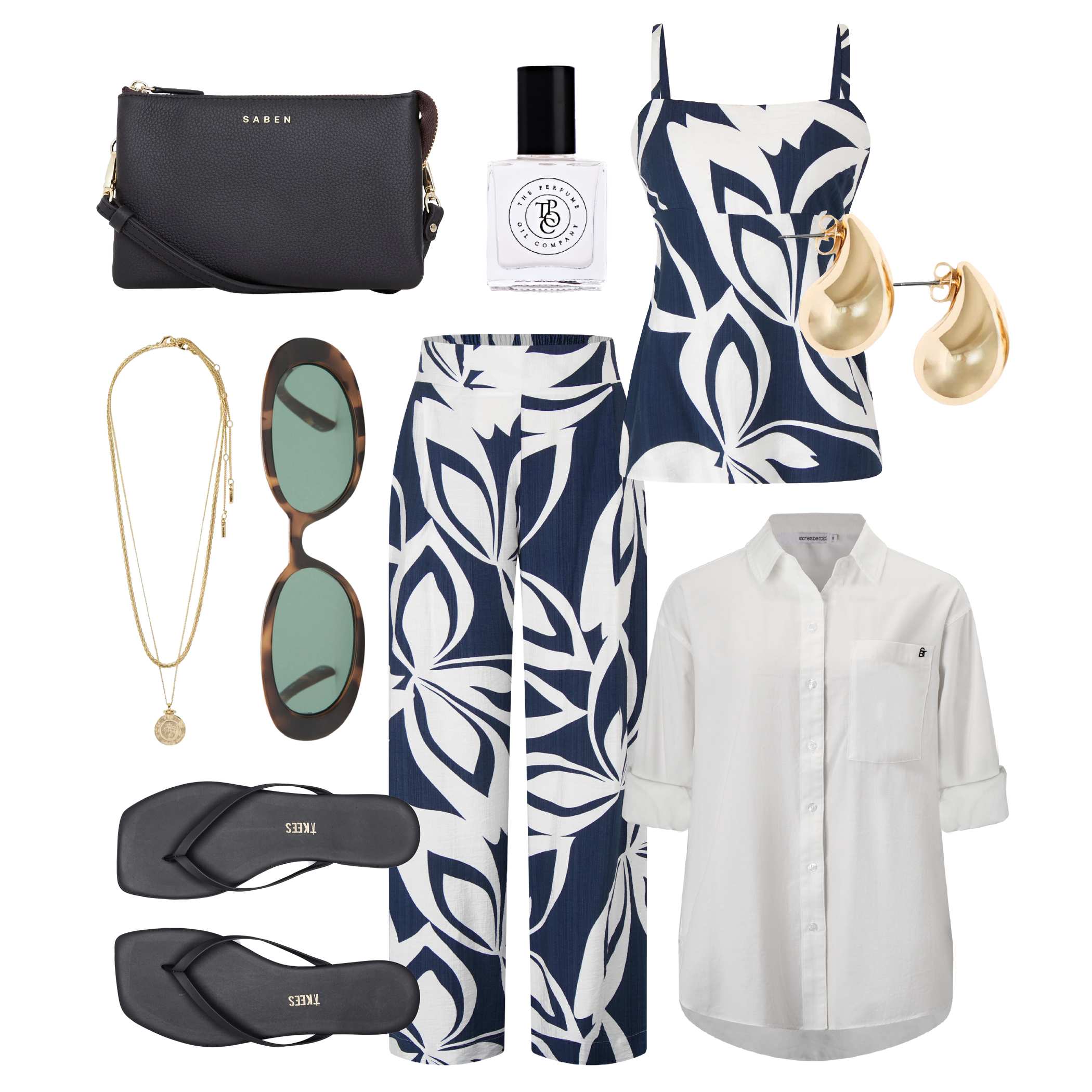 Meet your new go-to for long summer days. This look nails the balance between relaxed and refined. A bold printed co-ord takes centre stage, balanced with a crisp white shirt that doubles as your go-anywhere layer. Slip into chic black slides, throw on a sleek crossbody, and finish with gold accents for effortless polish.