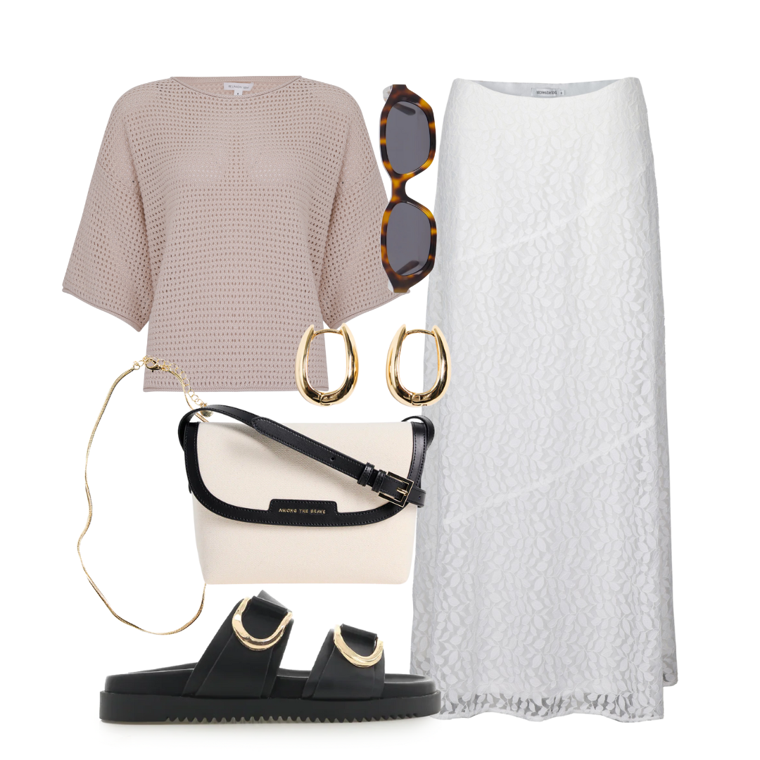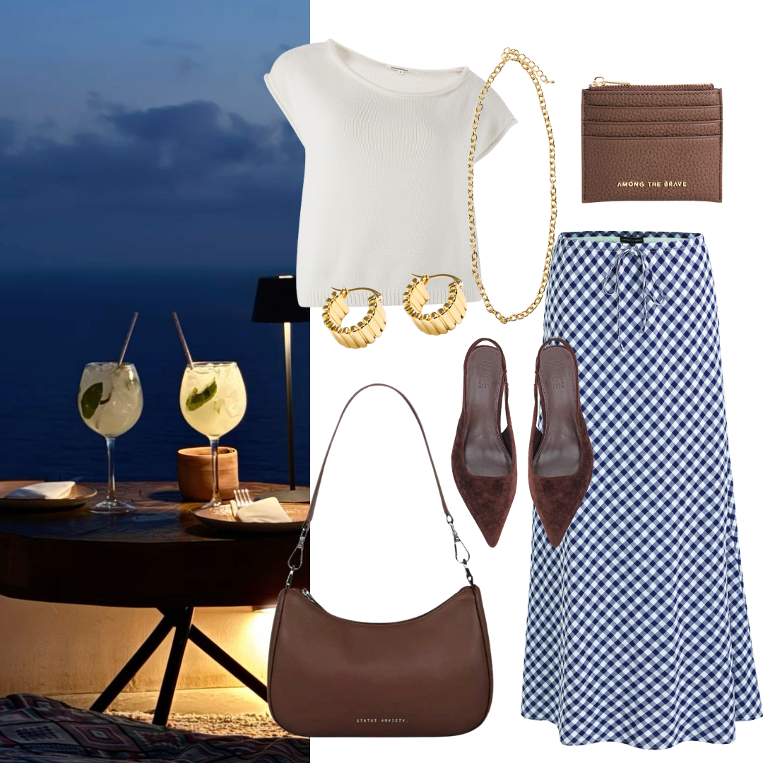 This is your golden hour go-to, where timeless elegance meets a touch of play. A soft knit top and gingham skirt create a dreamy silhouette, elevated by rich chocolate accessories and gold-toned jewellery. Whether it’s dinner by the sea or drinks with the girls, this look is your perfect plus one.