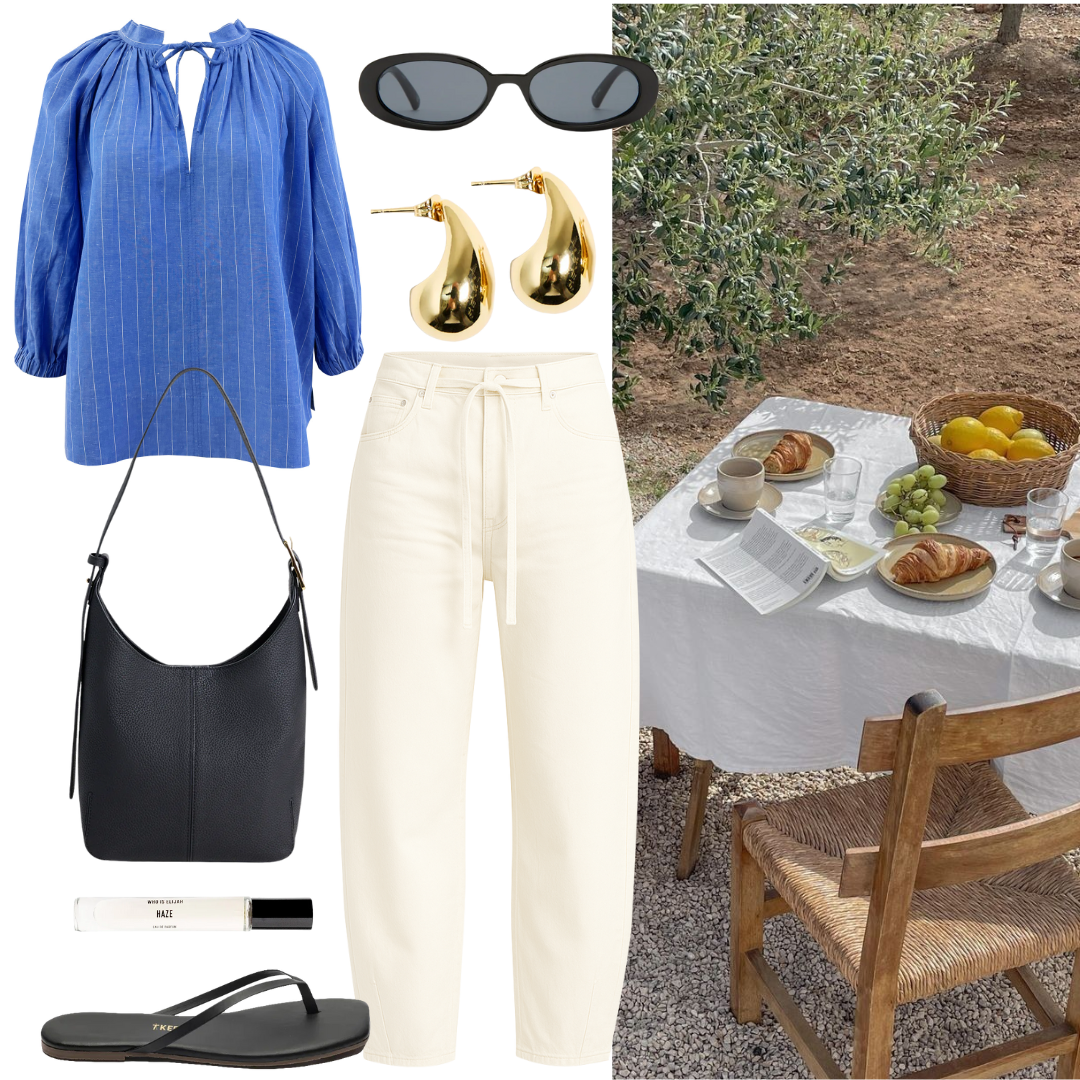 Channel effortless Mediterranean charm with this laidback yet polished look, perfect for slow mornings and sun-drenched getaways. A breezy blue blouse pairs beautifully with relaxed cream pants, elevated by luxe gold accents, minimalist sandals, and a sleek leather bag.