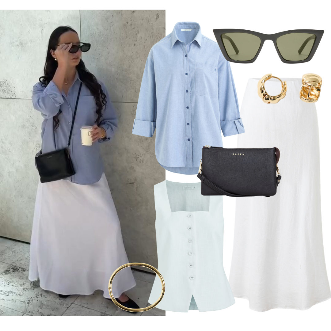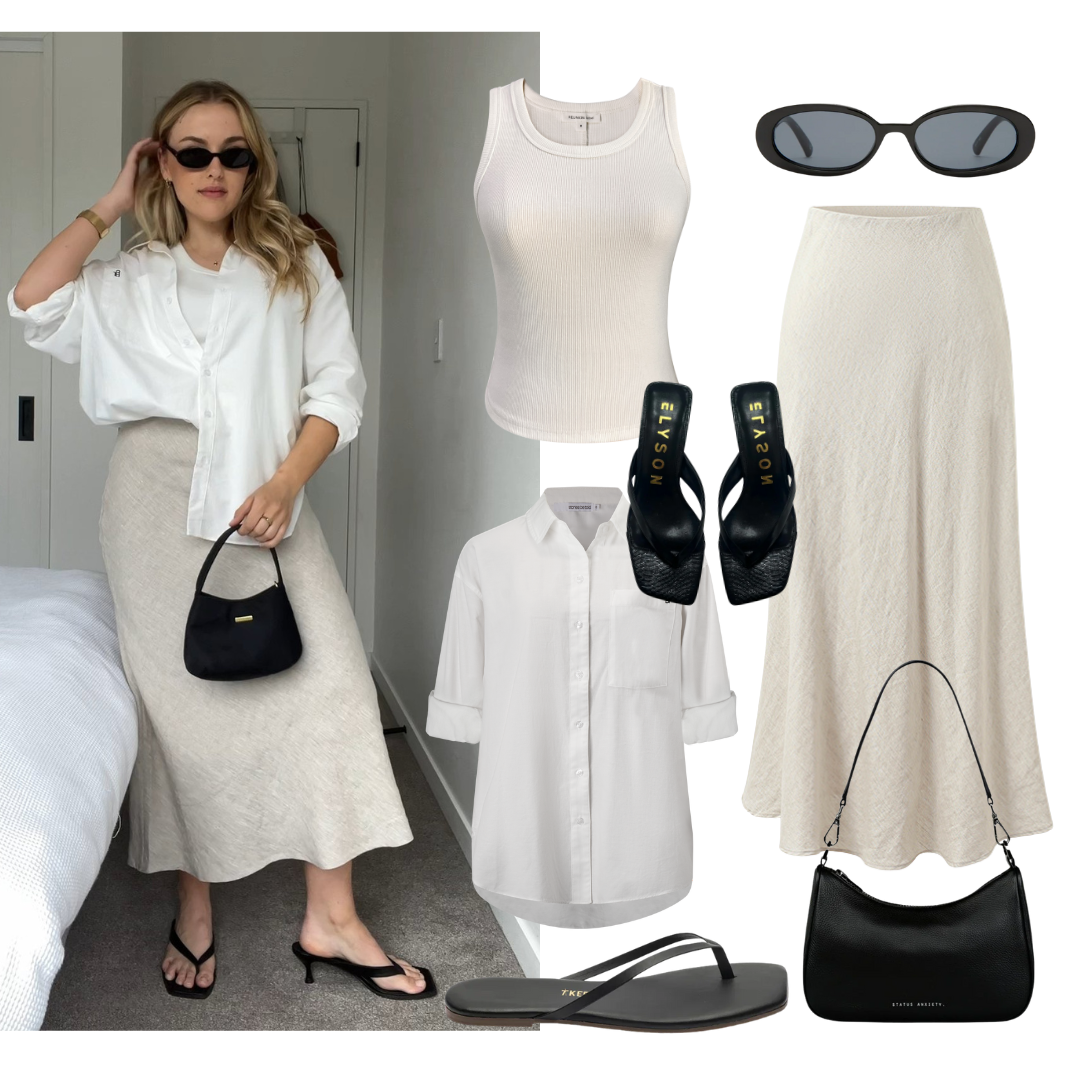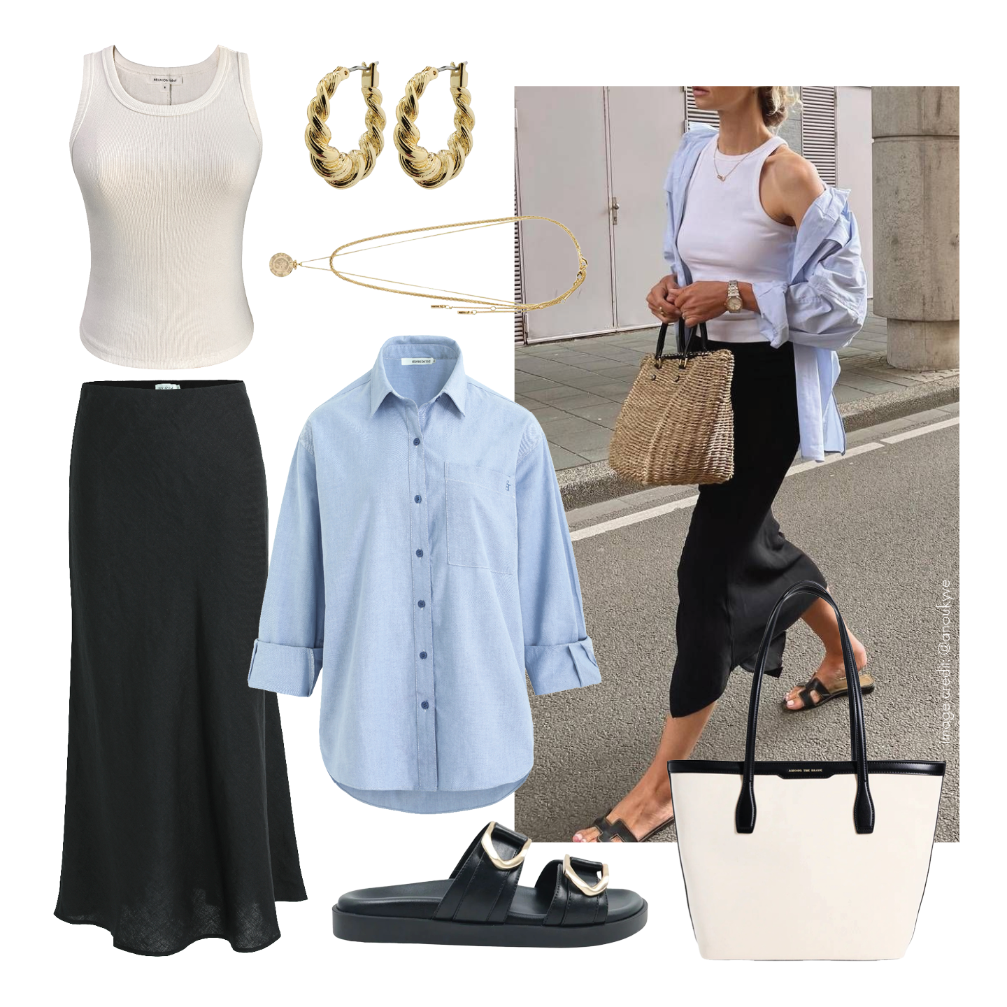This look is your go-to for coffee runs, long walks, or casual catch-ups that still deserve a stylish moment. A classic tank and midi skirt lay the foundation, while an oversized shirt adds that relaxed cool-girl vibe. Finished with gold details, comfy-chic sandals, and a monochrome tote, this outfit proves basics are anything but boring.