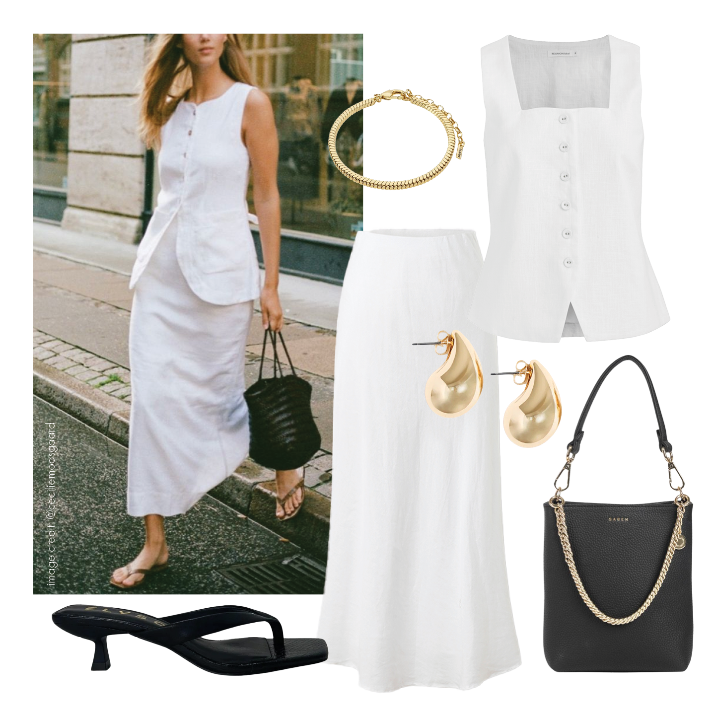 Step into the art of refined minimalism with this white-on-white moment that’s pure linen luxe. This look is all about crisp silhouettes, soft texture, and understated polish. Finished with sculptural gold jewellery, sleek black accessories, and barely-there heels, this is the kind of look that turns linen into a lifestyle.