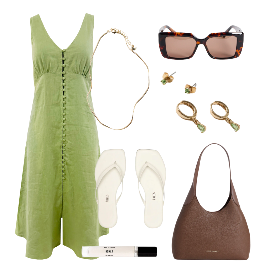Ease into the afternoon with this fresh, linen-forward look that feels relaxed yet refined. Soft green tones, simple gold jewellery and clean white slides create a breezy outfit that works perfectly for long lunches. Finished with a rich brown shoulder bag, it is the kind of look that carries you effortlessly from sunshine sips to slow-paced catch-ups.