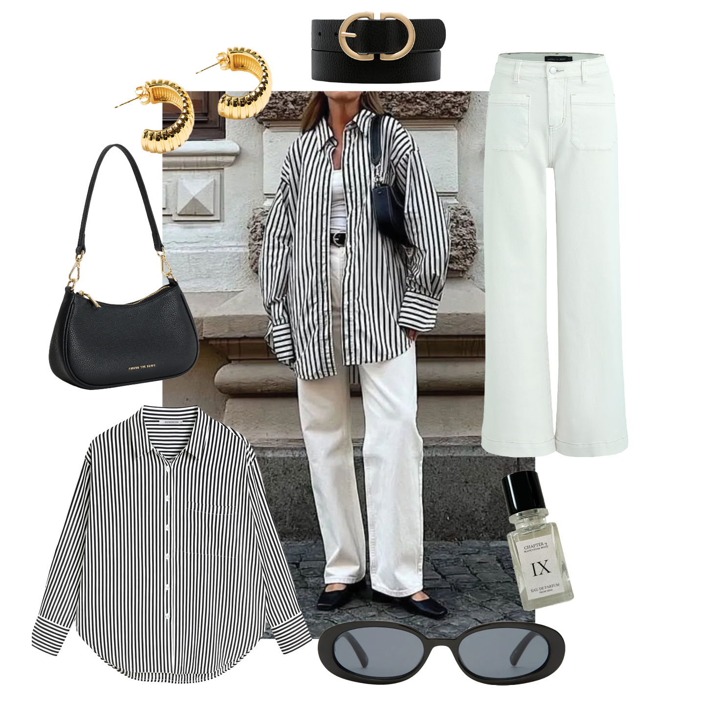 Polished, effortless, and ready for wherever the day takes you. A relaxed striped shirt paired with crisp white wide-leg jeans creates the perfect balance of ease and refinement. Finished with bold gold hoops and sleek black accessories, this is your go-to look for city strolls, long lunches, and everything in between.