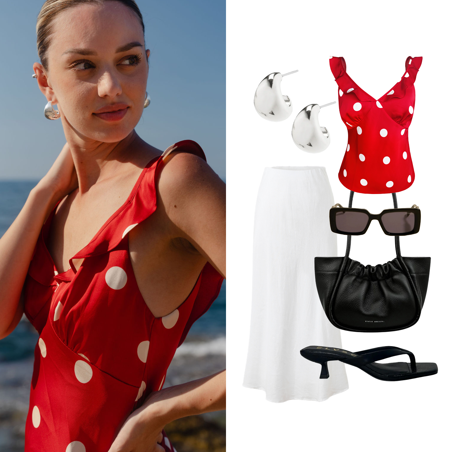 Playful yet polished, this look is made for sunny days that turn into sunset sips. A bold red polka dot top steals the show, balanced by a flowing white skirt that brings effortless elegance. Finished with sleek black accessories and sculptural silver hoops, it’s a chic mix of retro flair and modern minimalism.