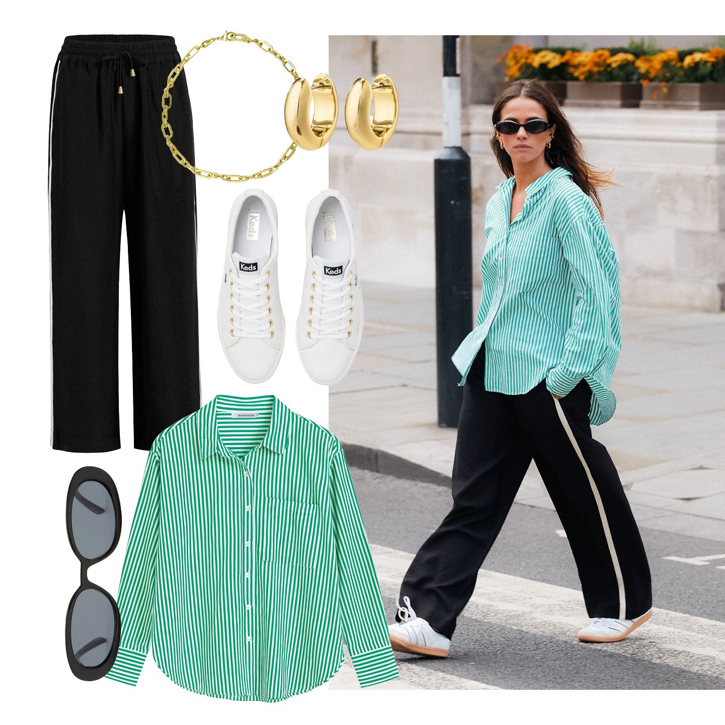 This look brings easy street style to life. The green striped shirt adds a fresh pop of colour against sleek black trousers, while crisp white sneakers and gold accents keep it elevated. Throw on bold shades and you’re set for coffee runs, city strolls, or wherever your day takes you, style made simple.