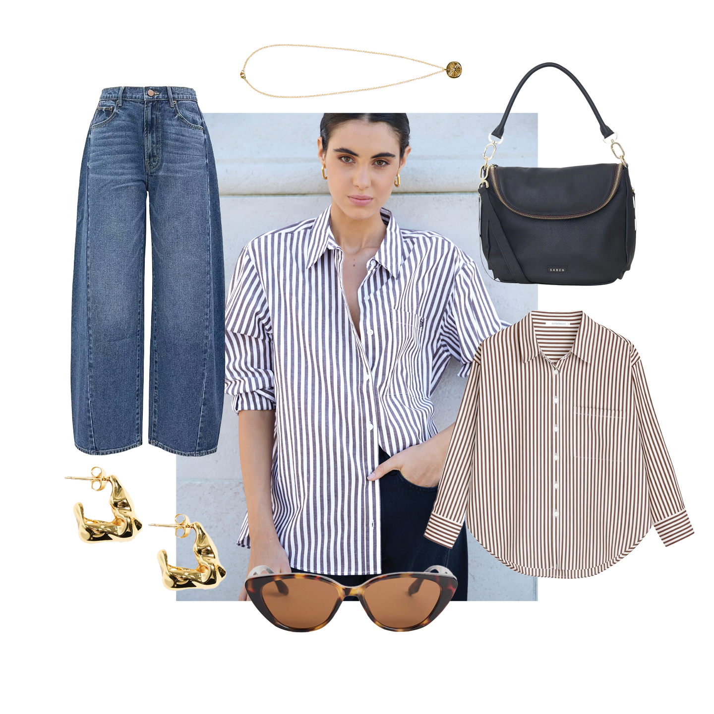 Effortless style starts with the perfect striped shirt and relaxed denim. This laid-back look pairs classic blue jeans with a crisp button-up, elevated with gold jewellery, a sleek shoulder bag, and timeless sunnies. Perfect for coffee dates and weekend errands.