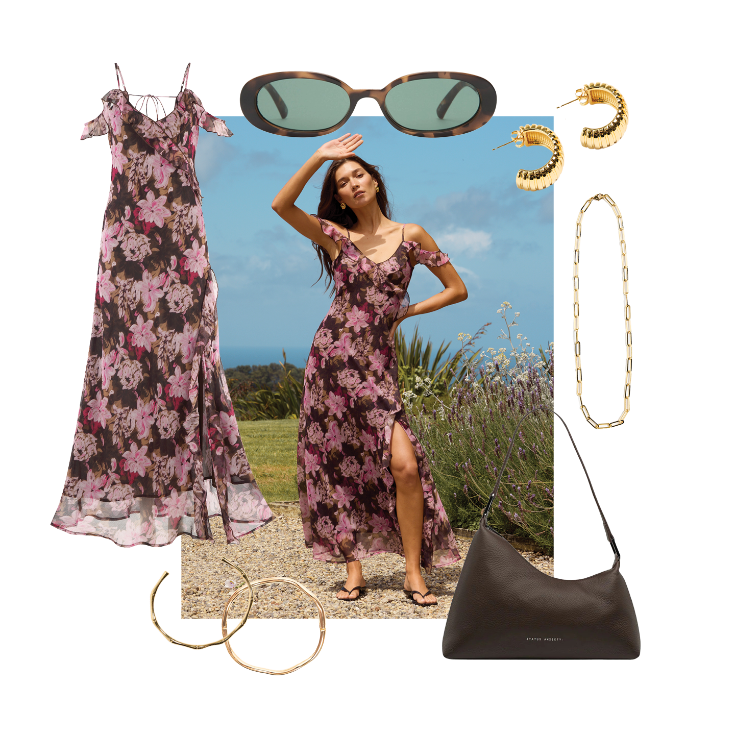Romantic florals meet stylish celebration in this dreamy event-ready look. A flowing floral dress brings soft femininity, styled with statement gold jewellery, sleek sunglasses, and a chic shoulder bag for an elevated finish. Perfect for long lunches and sunset celebrations.