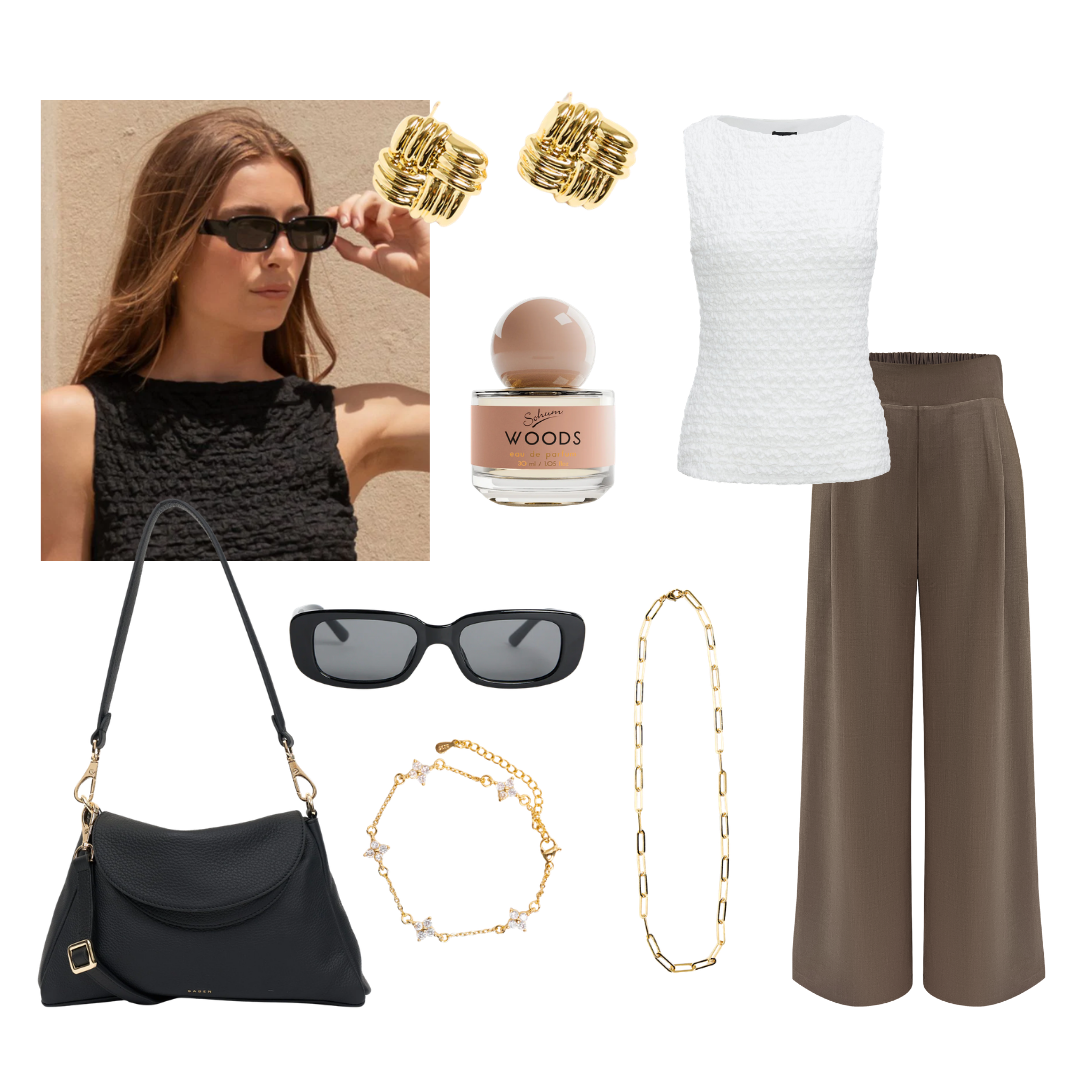 Cool, confident, and effortlessly put together. ‘Cool girl errands’ pairs a textured tank with relaxed wide-leg trousers for that polished but off-duty vibe we all love. Finished with sleek sunnies, statement gold jewellery and a classic black shoulder bag, it’s the kind of look that turns a coffee run into a main character moment.