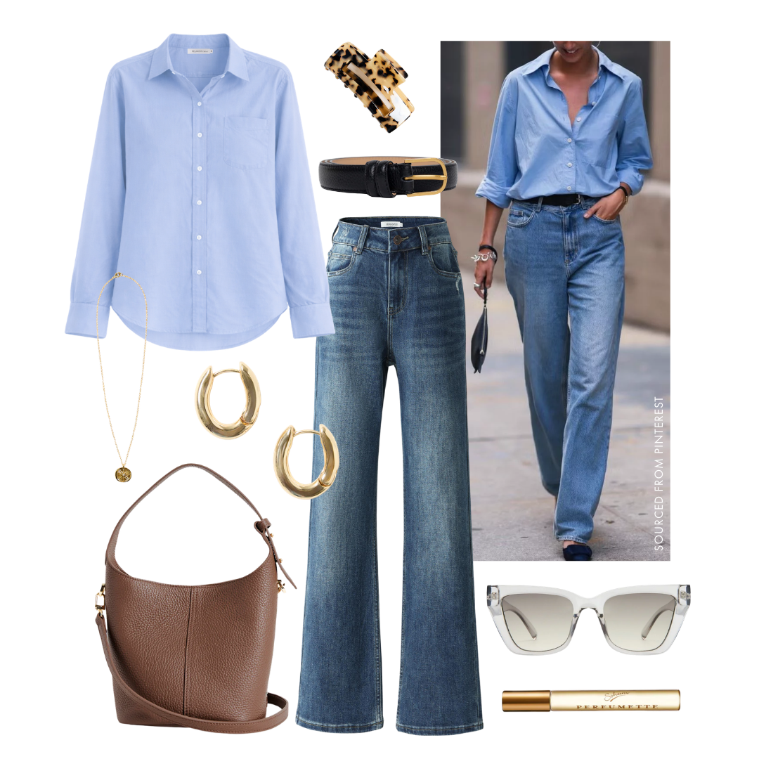 Serve effortless ‘90s icon energy with this clean, classic pairing. A crisp blue shirt tucked into relaxed wide-leg jeans creates an easy, polished silhouette that feels timeless and cool. Finished with gold jewellery, a sleek belt, and a soft leather bag, it’s the kind of look that makes everyday styling feel effortlessly put together.