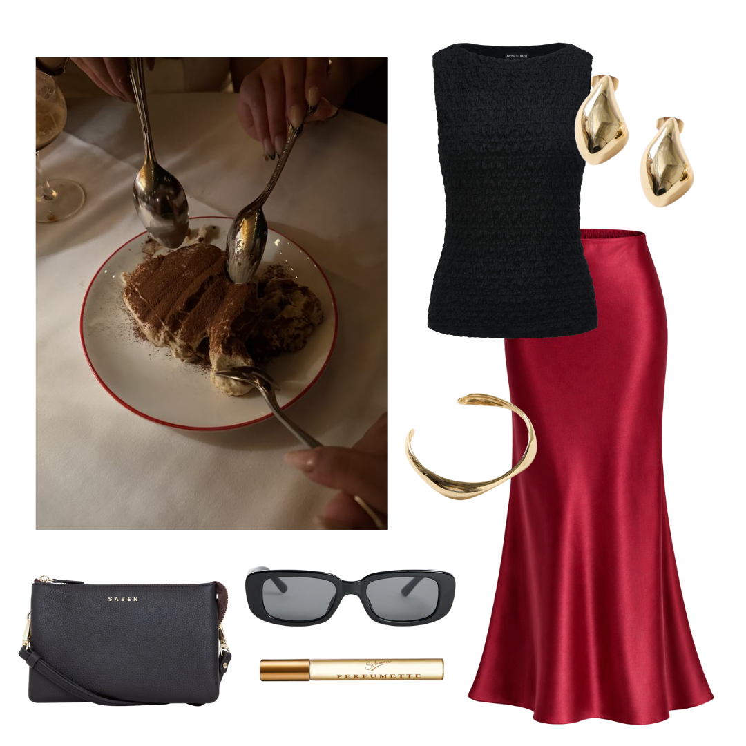 From desk to dinner, this look moves with you. A textured black top keeps it polished for the office, while the rich red satin skirt brings the drama for dinner plans. Finished with bold gold accents and a sleek crossbody, it is effortless, confident and ready for you to own your 9am to 9pm style.