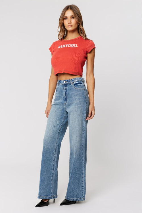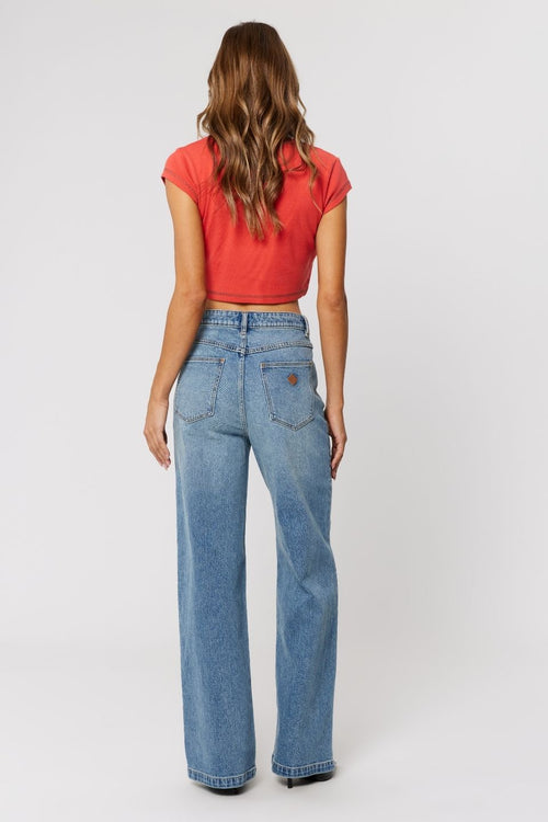 Designed with a high-rise waist that sits comfortably above the hips, these Abrand jeans hug through the hips and thighs before dropping into a wide leg from the hip for a clean, elongating silhouette. The fitted top block balances the volume through the leg, giving shape without feeling restrictive.