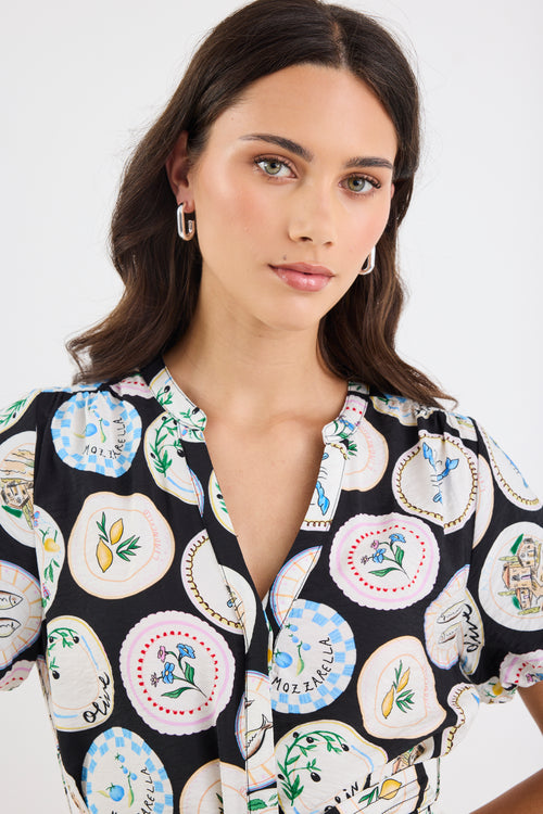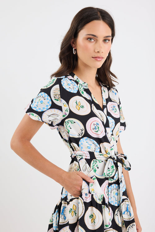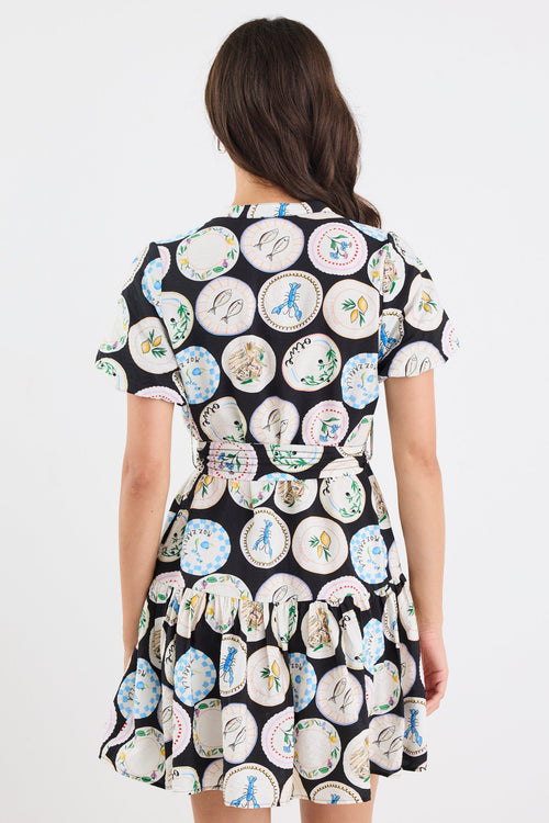 Adored Black Holiday Print Short Sleeve Button Front Mini Dress