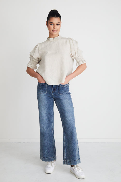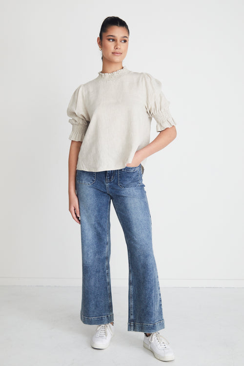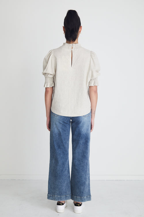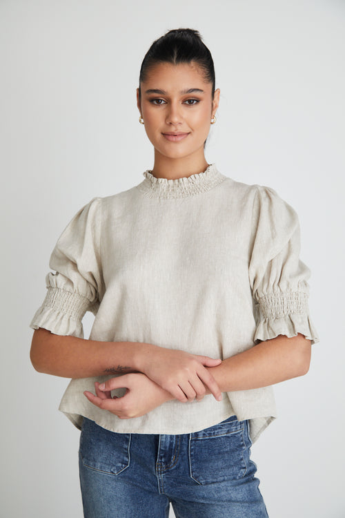 The Affection Natural Linen Shirred Neck Ss Top, a versatile and stylish addition to your wardrobe. This top is designed to elevate your everyday look with a touch of sophistication and comfort.