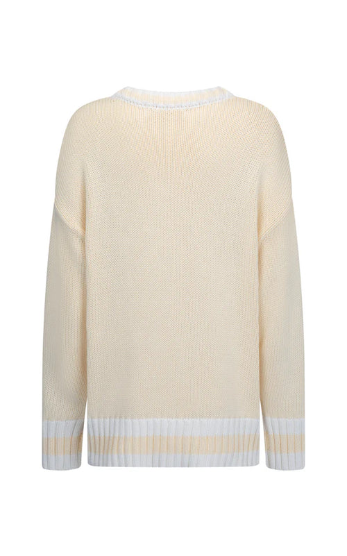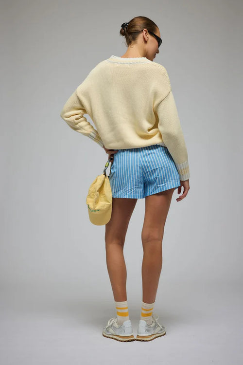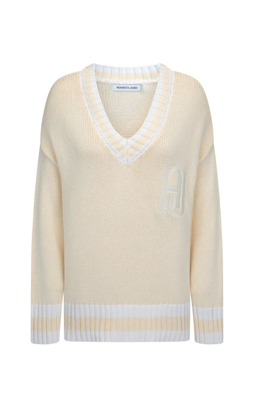 The AJ V-neck Knit Sweater in Lemon Cream is crafted from soft, versatile 100% cotton yarn. Featuring a ribbed v-neck, cuffs and waistband, with contrasting vanilla stripes, and embroidered AJ felt applique on the chest. This sweater is designed for a relaxed fit. Pair yours with our Libby Cotton Stripe Short Sky Blue Stripe for a timeless and chic look.