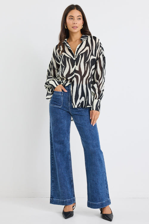 Model wears a black and white tiger print long sleeve button down shirt with jeans