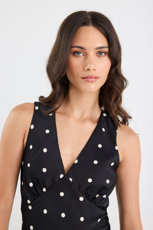 - Bias-cut for a body-skimming fit - Soft V-neckline with wide straps - Statement polka dot print on a satin finish - Maxi length with gentle flare from the hem - Fabric - 100% Polyester - Delicate