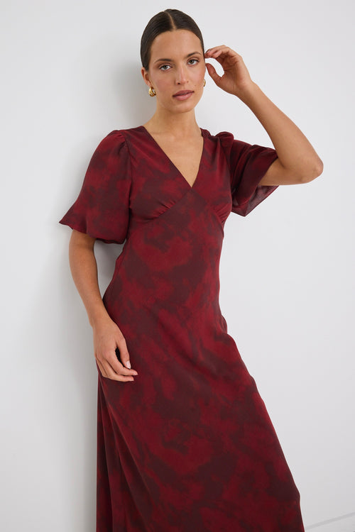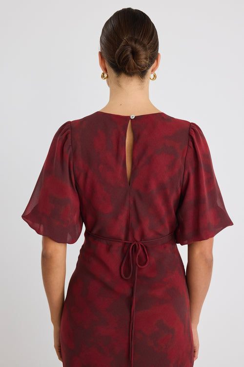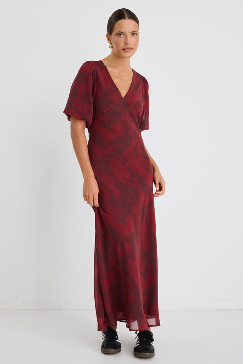 model wears a red plum smudge pattern short sleeve sheer maxi dress