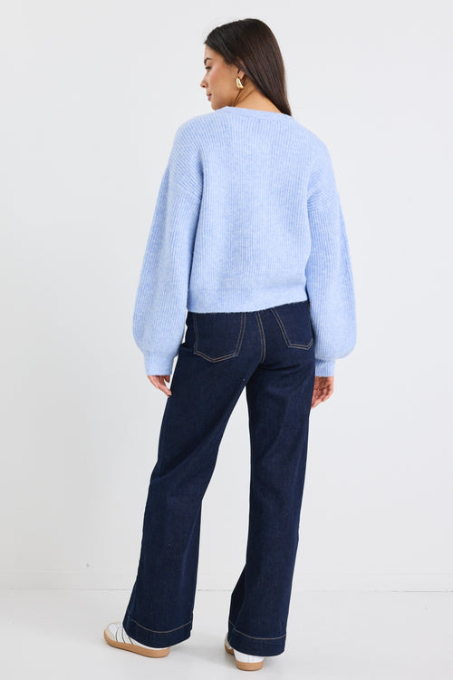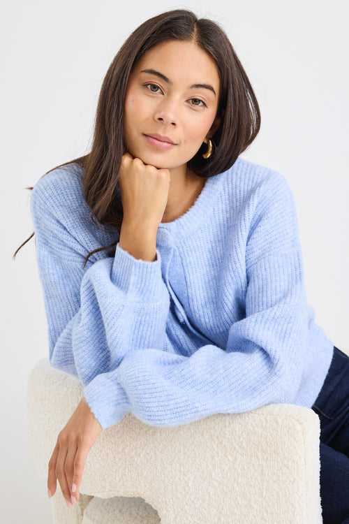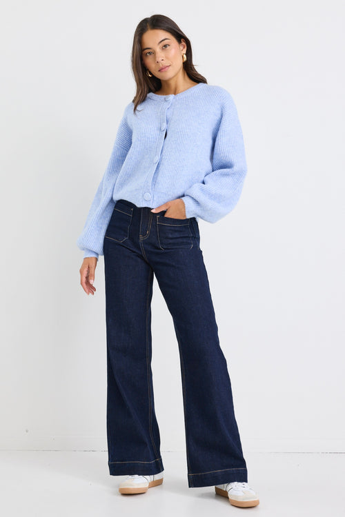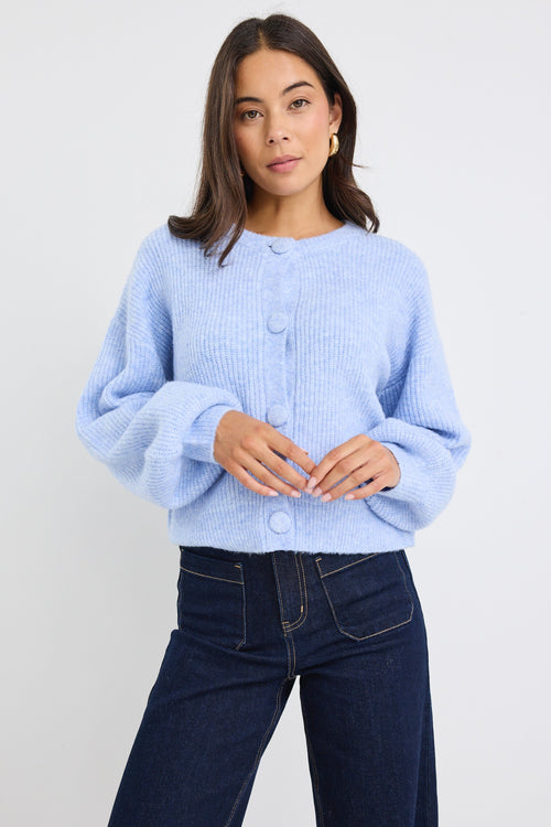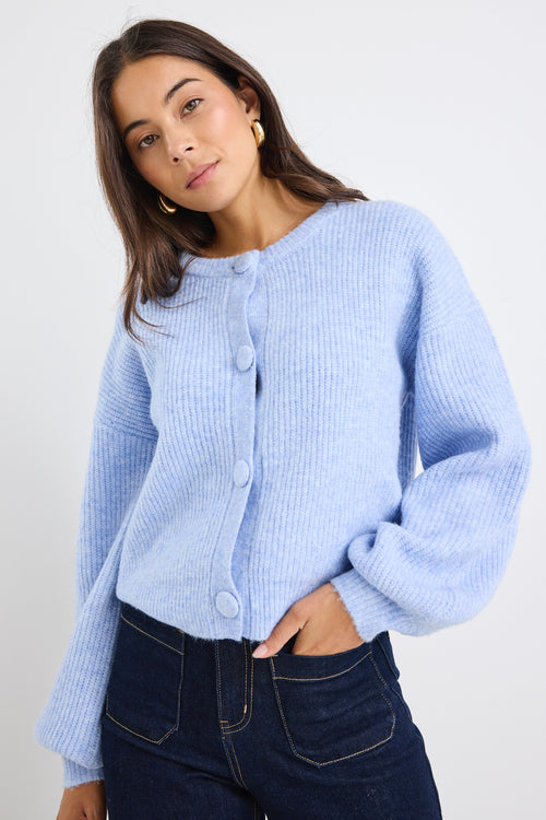 Woman wearing a soft ice blue ribbed cardigan with covered buttons, crew neck and full sleeves, styled with dark denim.