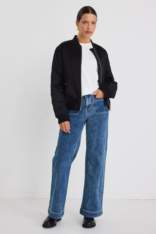 The Aviation Black Bomber Jacket brings effortless edge to your everyday look. With a clean silhouette, smooth lining, and silver zip accents, this piece is equal parts cool and comfortable. Perfect for high-low dressing, it toughens up dresses or plays it casual with denim. Style it with wide-leg trousers and sneakers for an off-duty vibe, or throw it over a silky slip dress and heels to add contrast and attitude.