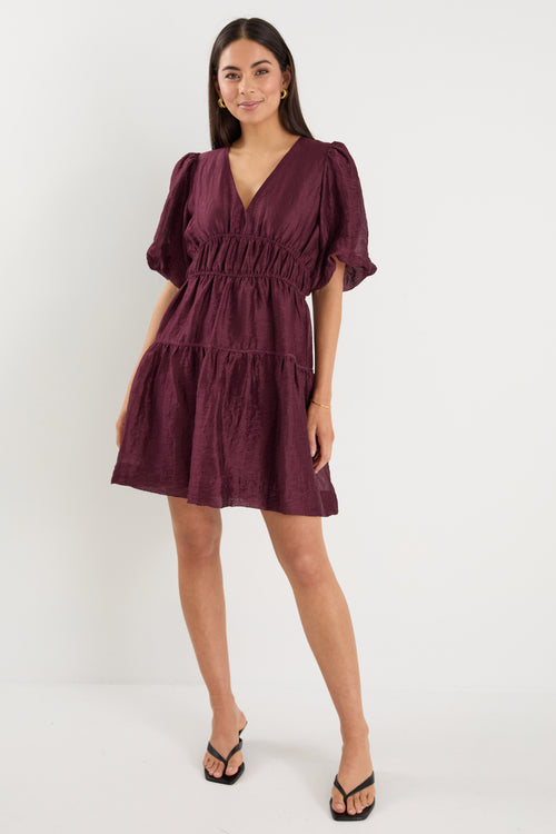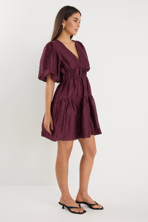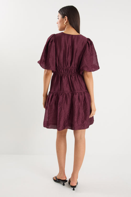 Axel Burgundy Plum Puff Sleeve V Neck Mini Dress