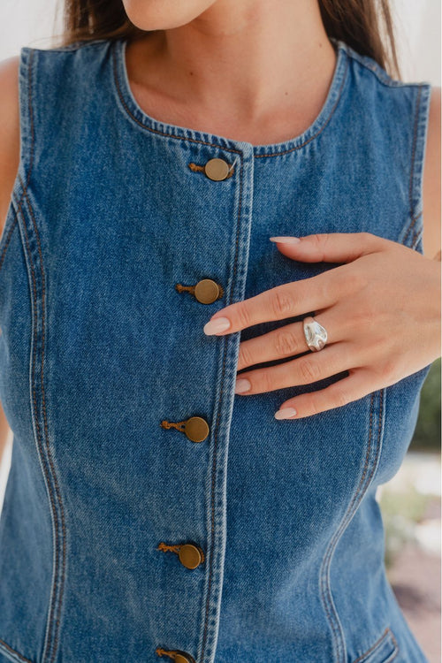 Chic meets utility with the Baseline marine blue vest a modern take on classic denim. Crafted from 100% natural cotton, this sleeveless style is structured yet soft, featuring a flattering tailored fit and striking silver button front. Perfect for layering or wearing solo, it delivers effortless high-low style with a nod to timeless cool. Pair it with skirts, denim or soft tailoring for endless outfit possibilities.