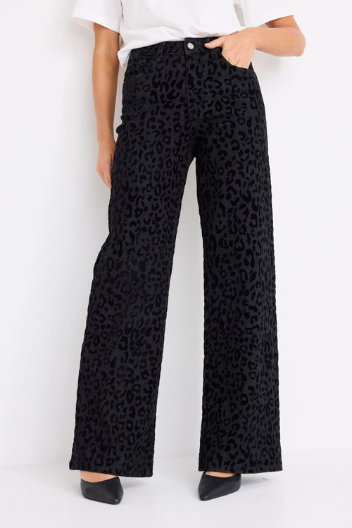 Belmont Black Animal Mid Rise Wide Leg Jean