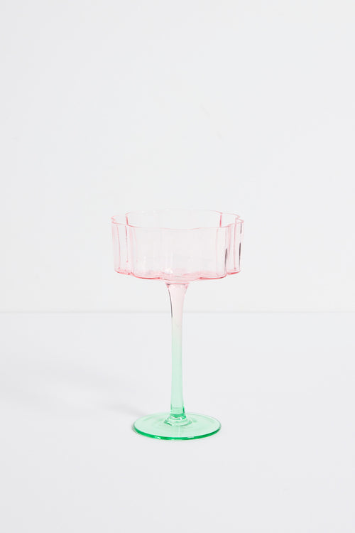 Elevate your everyday glassware with the Bloom Wavy Pink Green Cocktail glass by Willow & Mae. Crafted from a vibrant green and pink glass. This is a delicate, translucent pink cocktail glass features a scalloped edge and long stem. This glass has a vintage charm feel that makes it ideal for serving cocktails, champagne, or desserts at stylish gatherings.