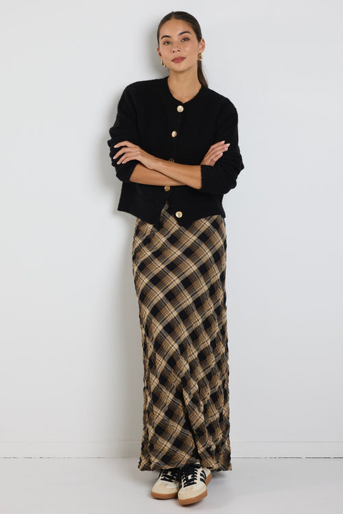 Woman wearing a caramel and black check bias-cut maxi skirt with a black cardigan and sneakers.