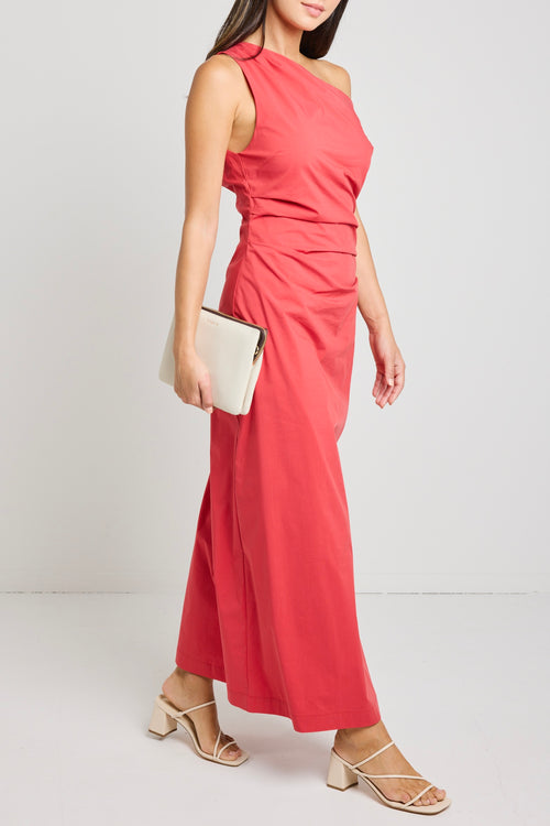 Woman wearing a bold red one-shoulder dress with flattering ruching, perfect for a glamorous night out.