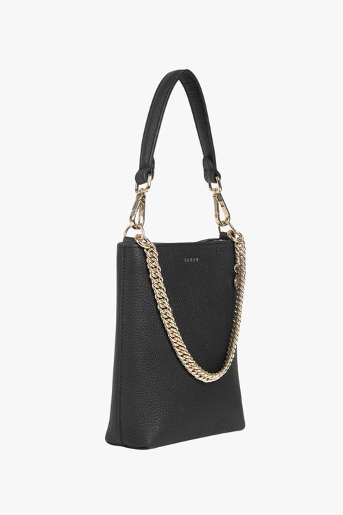 Front-facing view of a black leather bucket bag with a pebbled finish. The structured silhouette is elevated with a bold gold-tone chain draped across the front and matching hardware, including a circular branded charm. A detachable top handle completes the look, with the brand name 'SABEN' embossed in gold near the opening.
