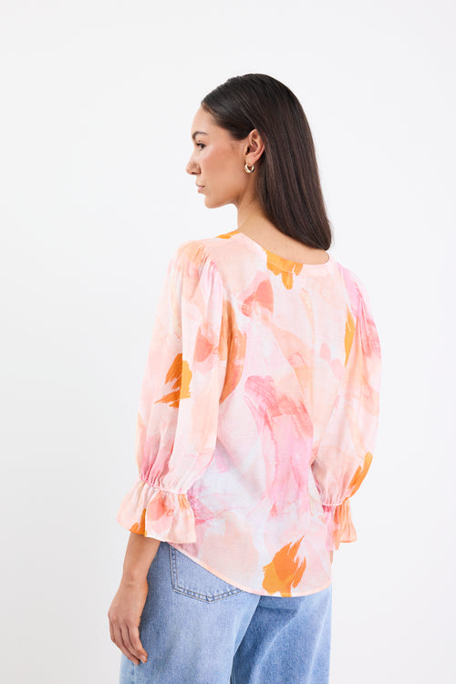 Add a burst of warmth and color to your wardrobe with the Compulsion Sunset Print Top. Featuring an eye-catching abstract sunset-inspired design in shades of pink and orange, this top is the perfect blend of comfort and style. The V-neckline and tie detail at the front add a touch of femininity, while the soft, breathable fabric ensures all-day comfort.