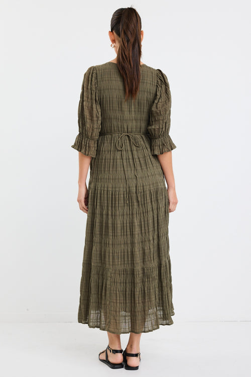 Dreamy Khaki Bubble SS Button Front Tiered Maxi Dress