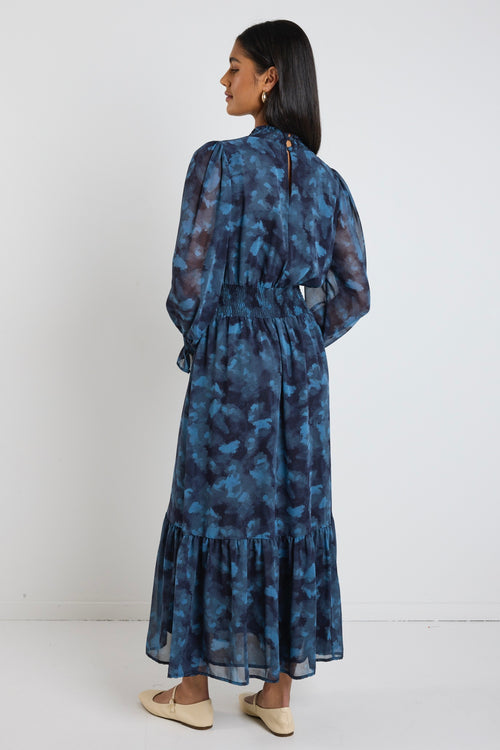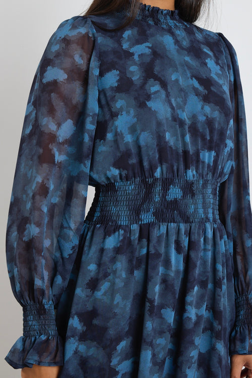 Ebony Blue Smudge LS Shirred Neck Midi Dress