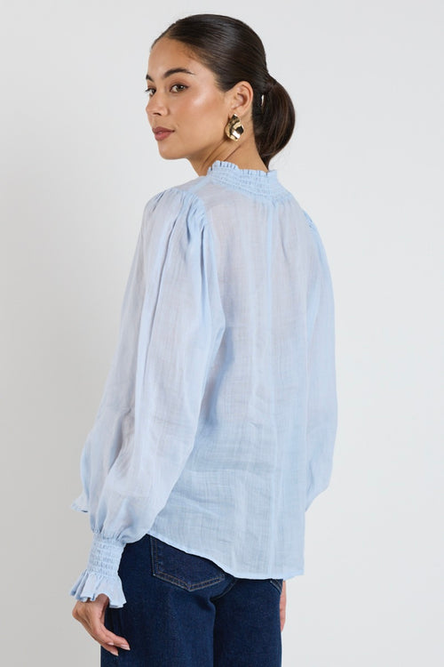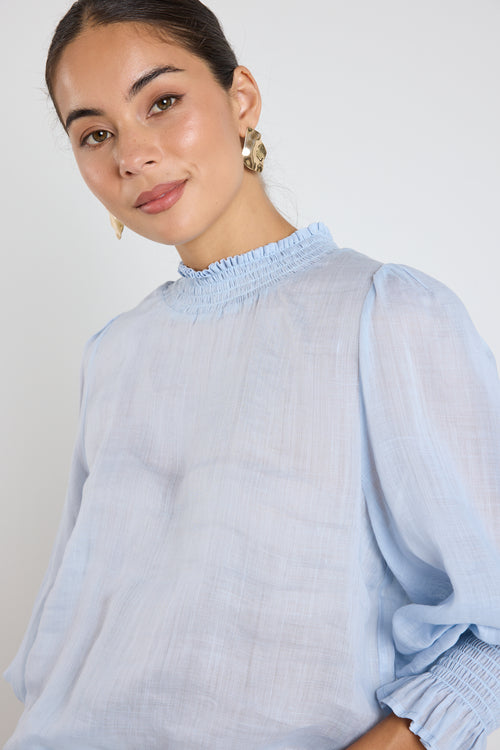 Embrace Ice Blue Ramie Shirred Neck LS Top