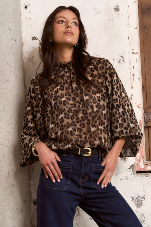 Unleash your wild side with the Embrace Leopard Shirred Top! This bold yet effortlessly chic piece adds an instant statement to any look. With its shirred neckline and cuffs, it offers a flattering silhouette while maintaining a comfortable fit. Perfect for both casual catch-ups and dressed-up evenings, it’s your new go-to for versatile, trans-seasonal styling. Dress it up with black tailored pants and heels, or keep it relaxed with  denim and boots.