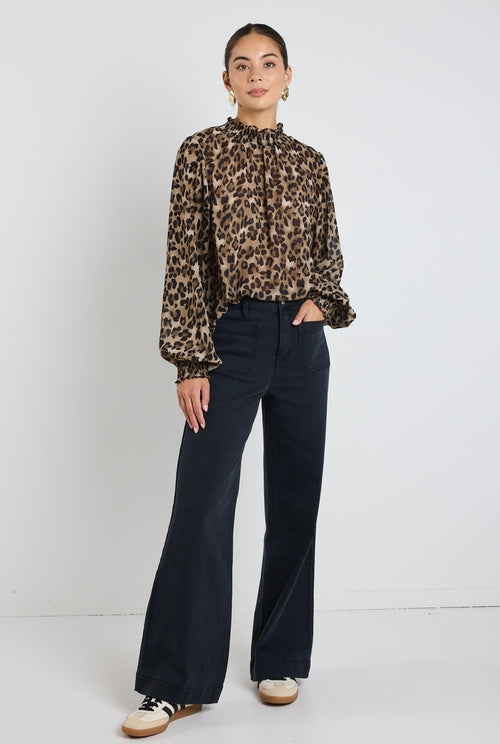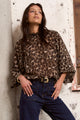 Woman wearing a leopard print blouse with a shirred neckline and cuffs, styled with high-waisted jeans.