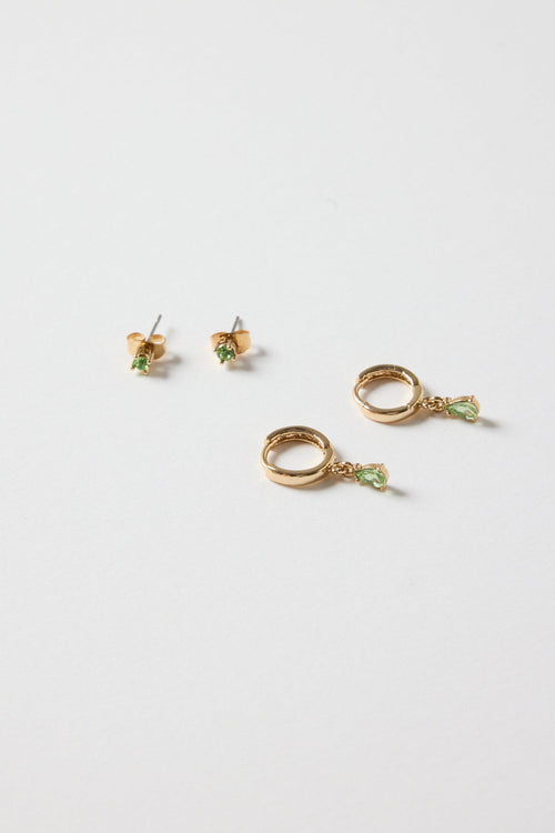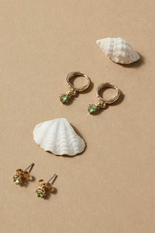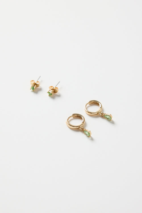 The beautiful Emerald Huggie Stud Set from Humble + Heart feature a gorgeous emerald coloured stud and huggie hoop. These earrings are made from alloy, giving you that warm, gold, glowing look!