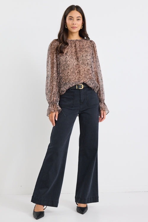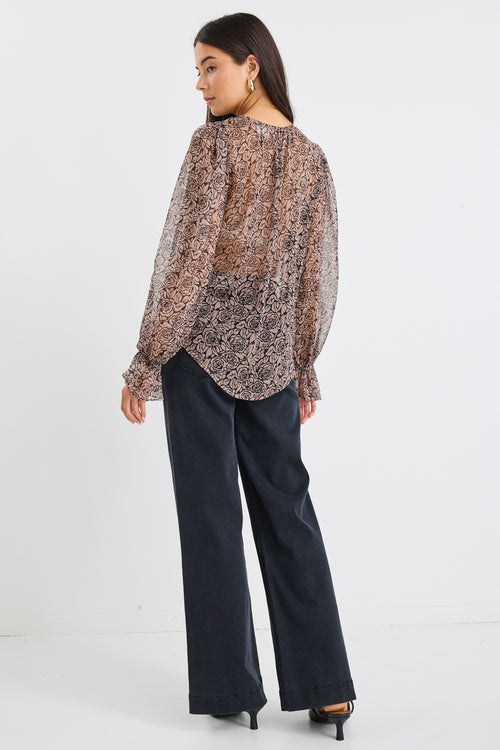 Endless Black Taupe Roses Georgette Blouson Sleeve LS Top
