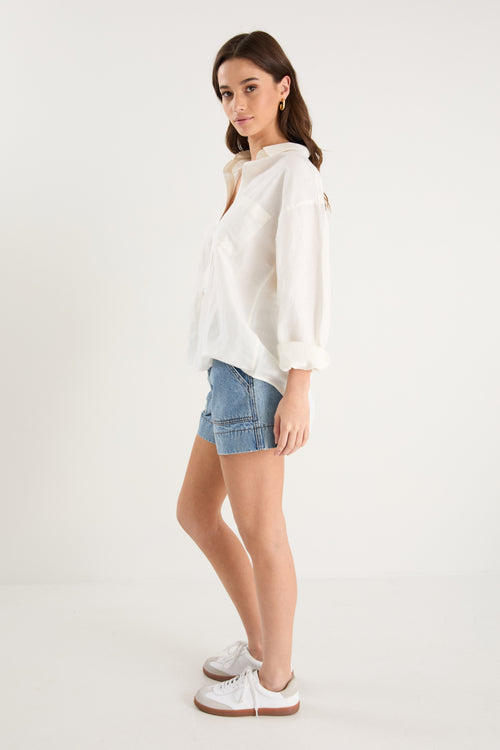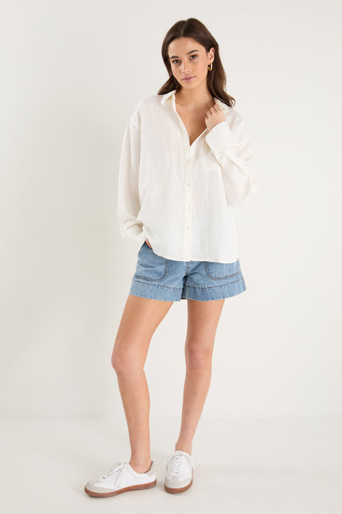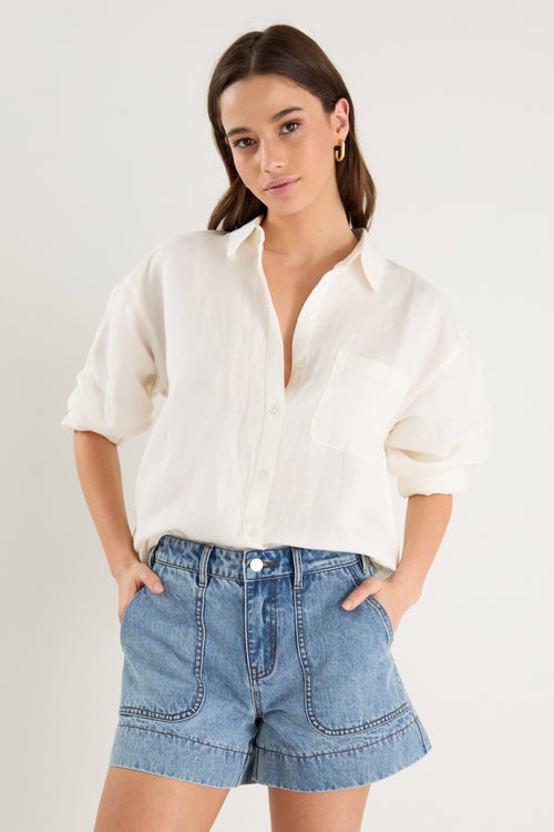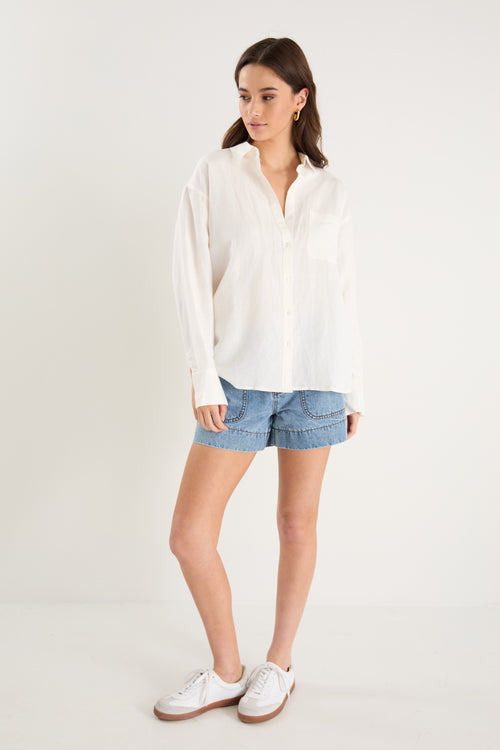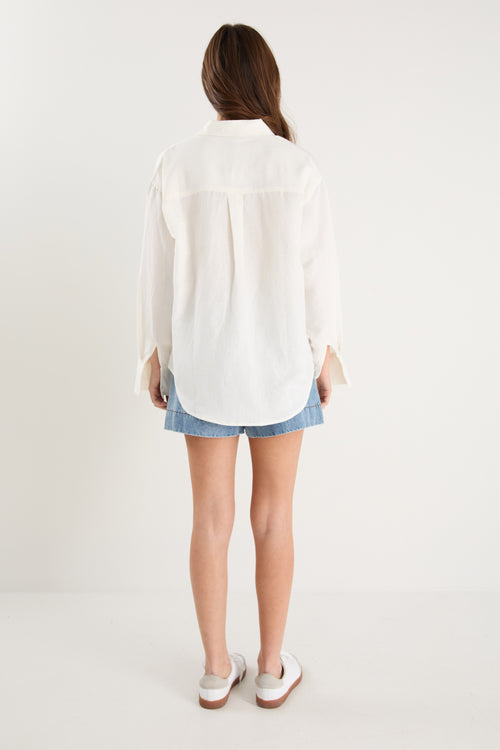- 55% linen, 45% viscose for softness and breathability - Oversized silhouette for a relaxed, effortless fit - Long sleeves with button cuffs for versatile styling - Vertical stripe print for a timeless, flattering finish - Made from natural fibres - Button front for endless styling options
