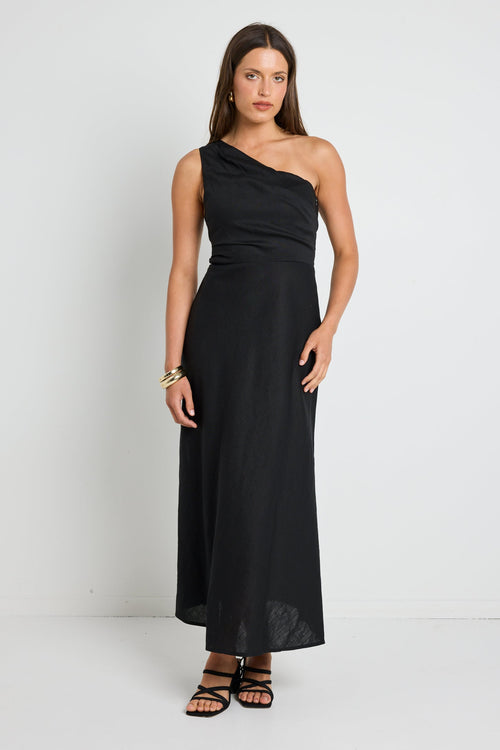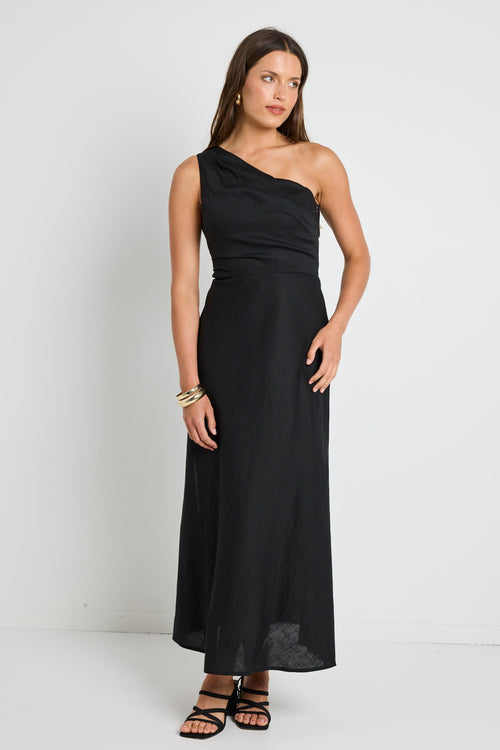 Turn heads with the Flirt black dress, a one-shoulder stunner that blends modern elegance with timeless sophistication. Its asymmetrical neckline and flowing maxi length create a graceful silhouette, perfect for evening events or special occasions. Radiate confidence and allure in this effortlessly chic masterpiece.