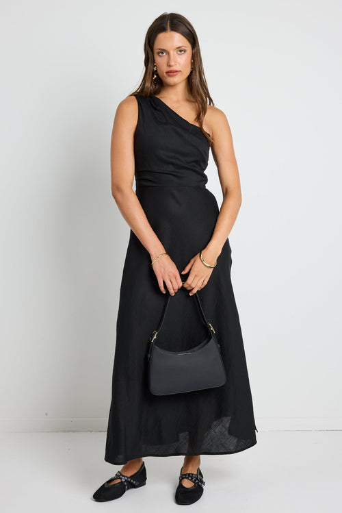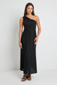 Woman wearing a one-shoulder black maxi dress with a flowing silhouette, styled with a black handbag for an elegant, sophisticated look.
