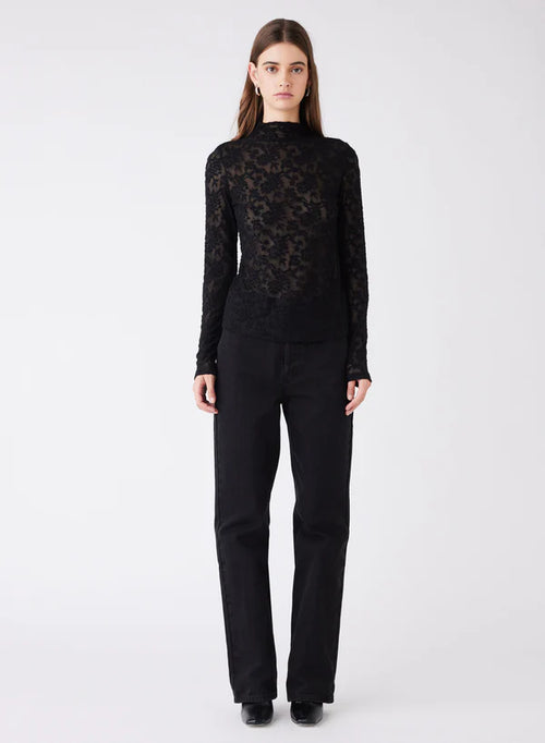 Model wears a black long sleeve lace top