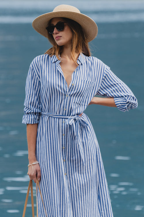 Woman wearing a blue and white striped shirt dress with a waist tie, side split and rolled sleeves