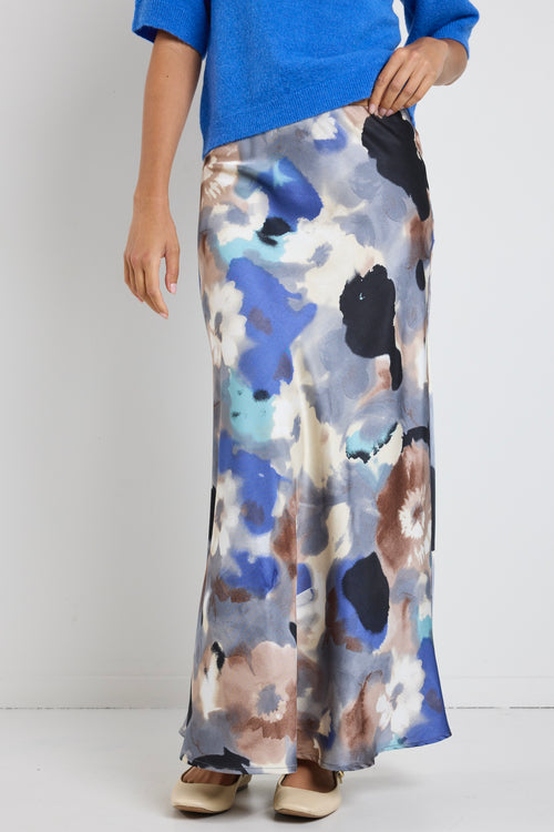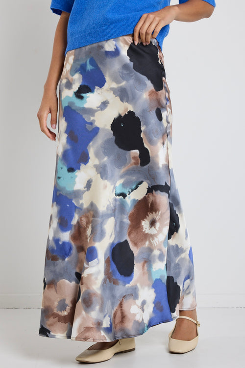 Frantic Navy Multi Watercolour Satin Bias Maxi Skirt